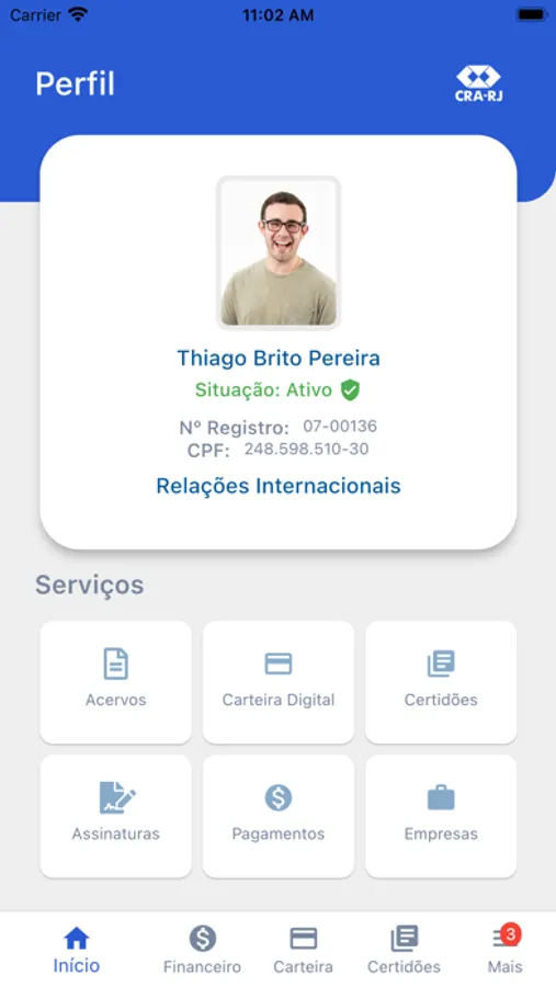 O Autoatendimento CRA-RJ foi feito para atender as demandas dos profissionais e estudantes registrados no CRA-RJ e tem o objetivo de oferecer serviços online como Carteira de Identidade Profissional e de Estudante Digitais, emissão de Certidões, pagamento de anuidades e taxas por cartão de crédito ou boleto.