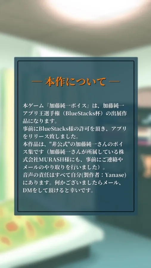 本ゲーム『加藤純一ボイス』は、加藤純一アプリ王選手権(BlueStacks杯)の出展作品になります。
