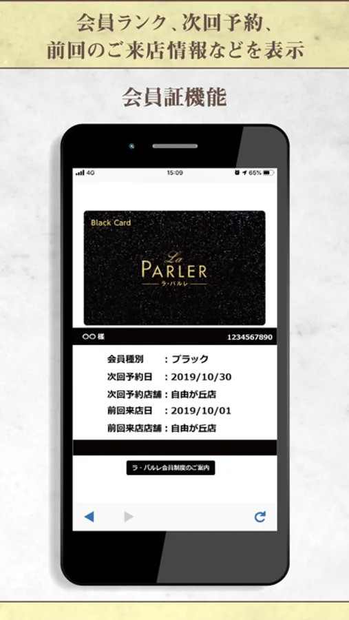 会員ランク、次回予約、前回来店情報が表示されます。会員ランクは、会員様のご利用状況に応じランクアップし、ランクに応じた特典をご用意しております。
