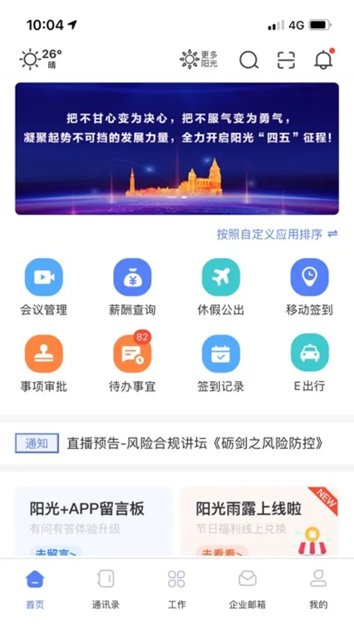 阳光保险集团一体化办公平台。通过将阳光保险E办公、MHR、E报销整合为1个APP,集成阳光学堂、驾驶舱、邮件等App的核心功能,实现灵活快捷的多种方式登录,为员工提供一体化、标准化、智能化的移动办公体验,同时避免重复建设,降低开发运维成本,节约公司资源。