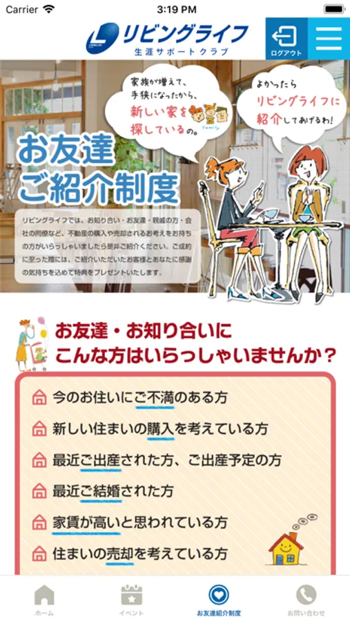 ご契約、お引渡し、その先の暮らしのなかでおこる疑問や不安を解決へと導き、お客様が毎日を心地よく暮らしていただけるようにサポートいたします。さらに会員限定のお得な割引キャンペーンやイベント情報、お得なクーポン情報をお届けします。