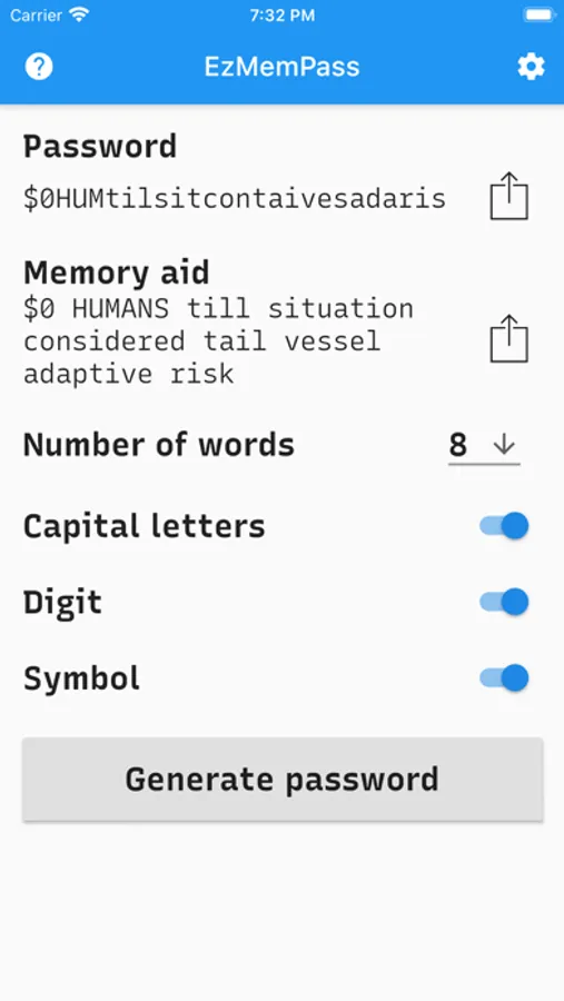 By memorizing the English-sounding sentence the password is easier to memorize than a random list of numbers and letters. However, because the password is generated using prefixes randomly selected from a list of 1024 prefixes, the ability to guess the password is not reduced by associating the prefixes with words.