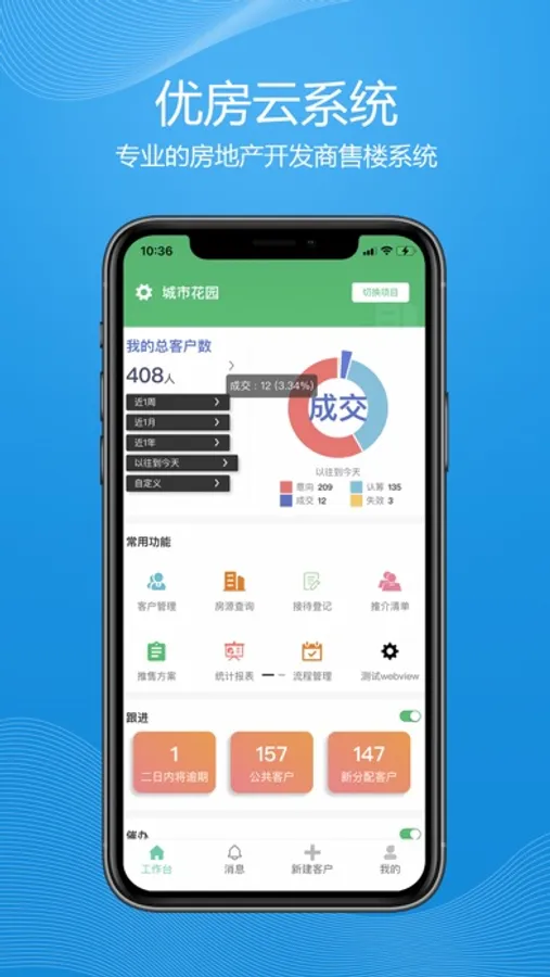 优房云APP是一款房地产售楼管理辅助工具,功能包含客户管理、房源查询、售后管理、财务管理、移动审批、统计图表、来访登记、开盘签到、渠道管理等,方便用户随时随地进行客户管理、售楼交易等操作。