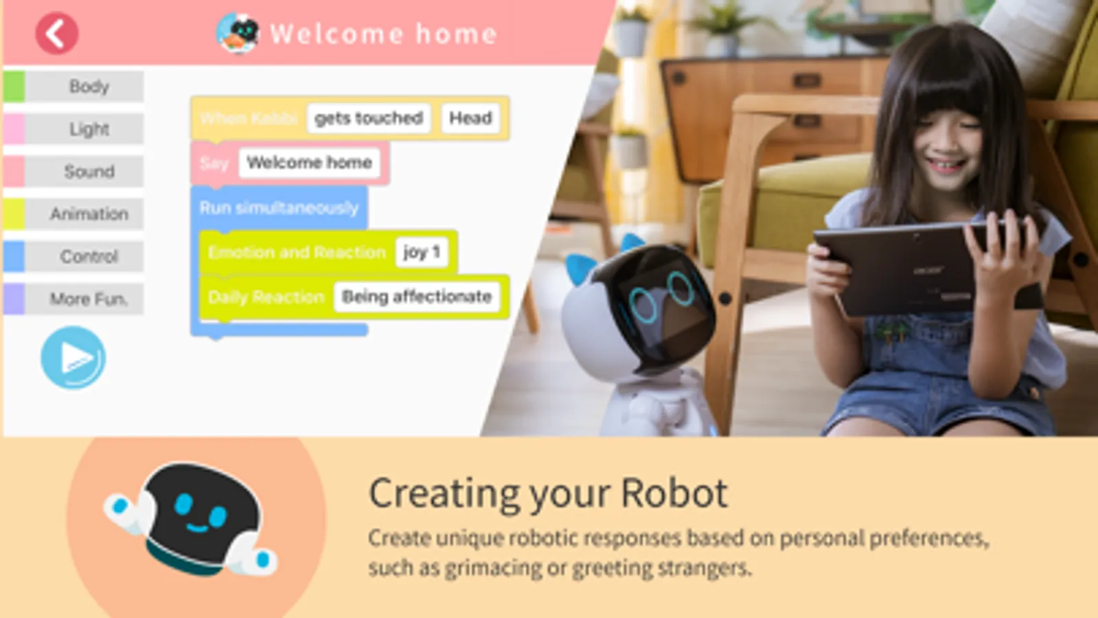 With a variety of blocks for movements, expressions, text-to-speech, camera and touch sensors, you can edit Kebbi's performance with ease. Make him host a party, or send birthday wishes etc.!