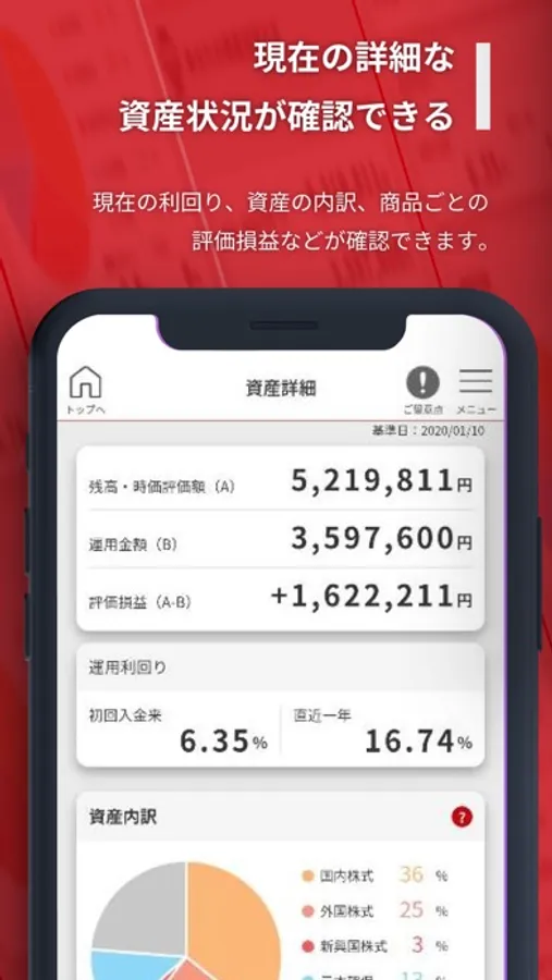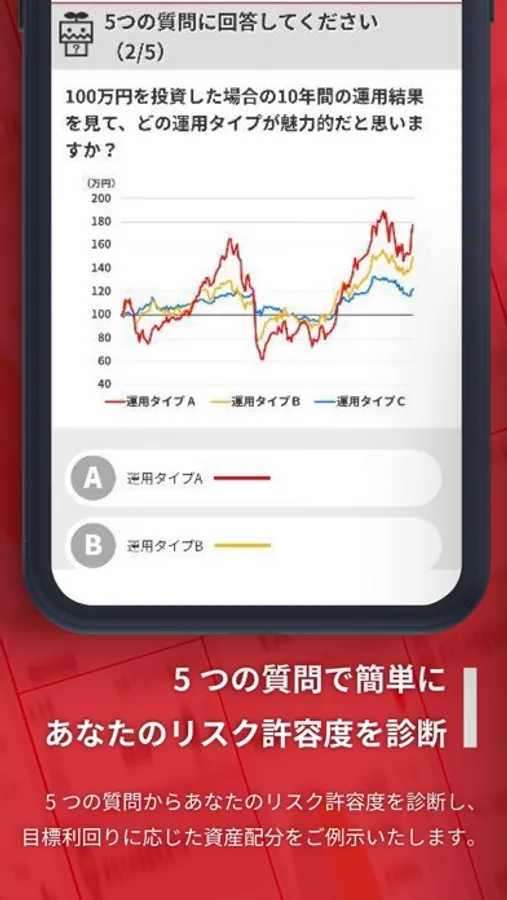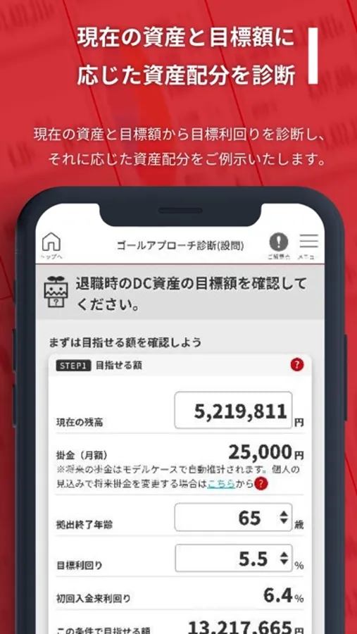 スマートフォンから気軽にDCの運用状況を確認できることに加え、いくつかの質問に答えることで、目標利回りをシミュレーションし、その目標利回りに応じた資産配分の例示もいたします。