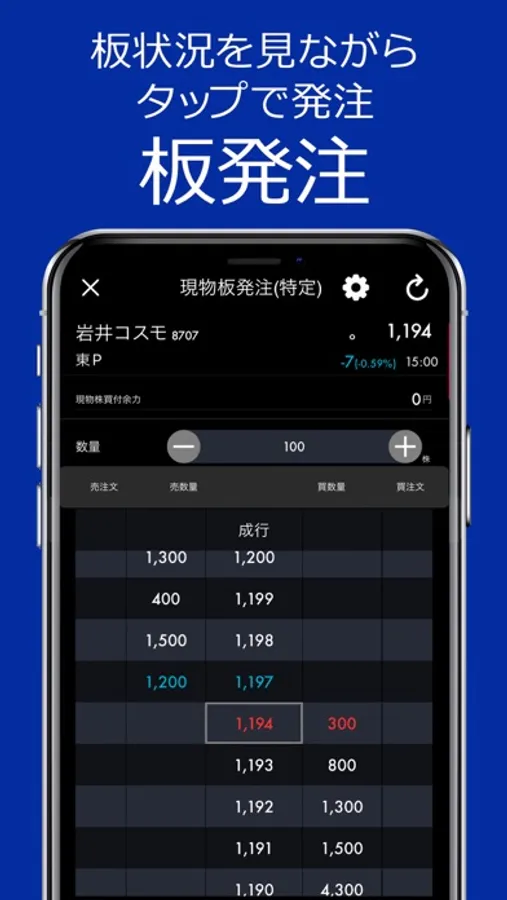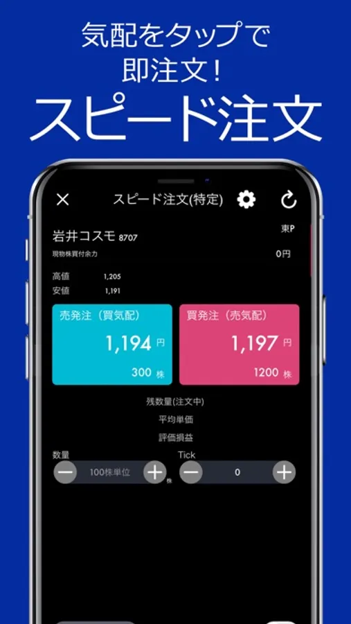 「スピード注文」・・・表示されている気配をタップしてすばやく発注できる画面です。