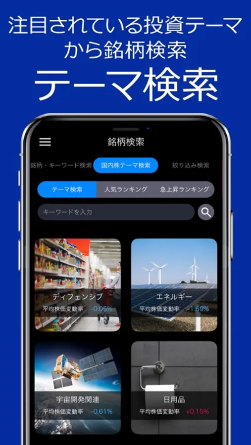 「テーマ検索」・・・注目されている投資テーマから関連銘柄を検索することができます。