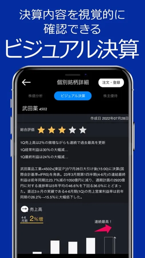 「ビジュアル決算」・・・企業の決算情報をビジュアル化して表示するので各期のデータを視覚的に確認できます。