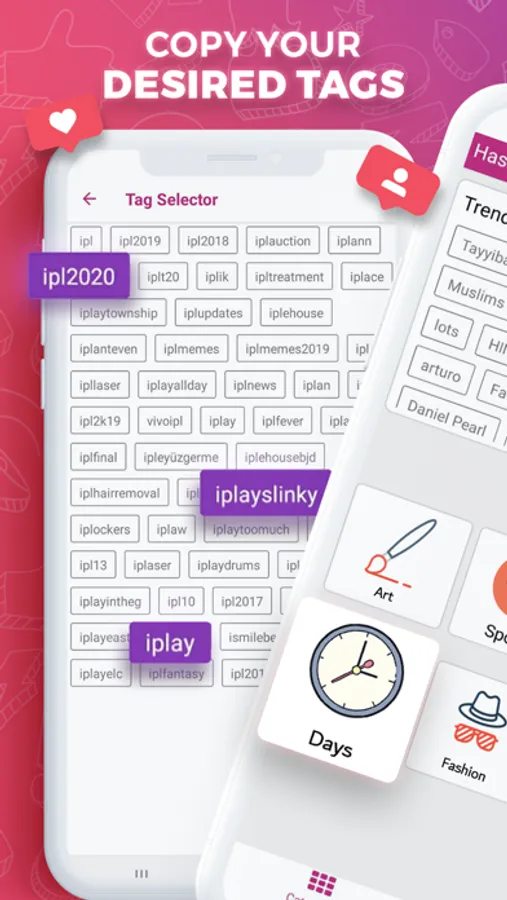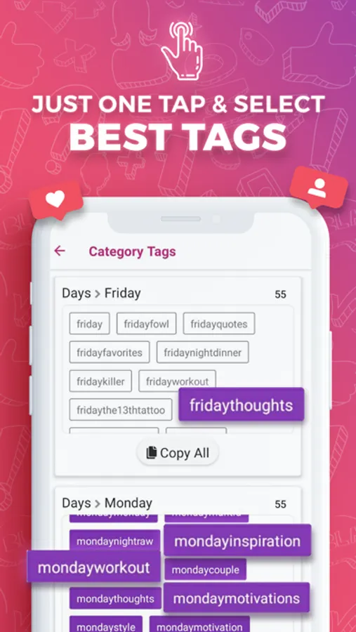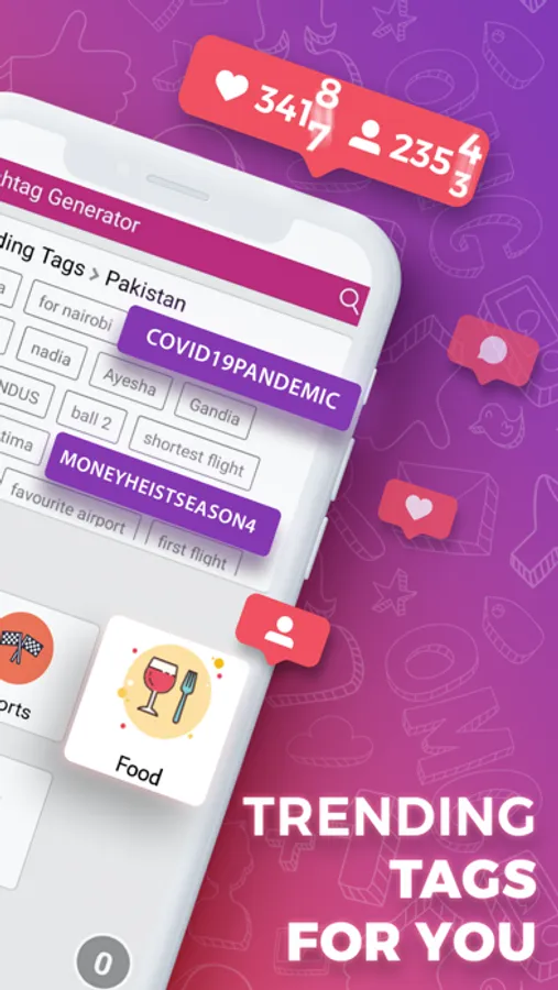 Use hashtag generator pro to find trending hashtags from different categories including sports, fashion, movies, food, nature, art and lifestyle. This app got you covered to find relevant hashtags quickly and pasting those to your Instagram, Twitter, TikTok, and YouTube posts to get more likes, shares and comments.
