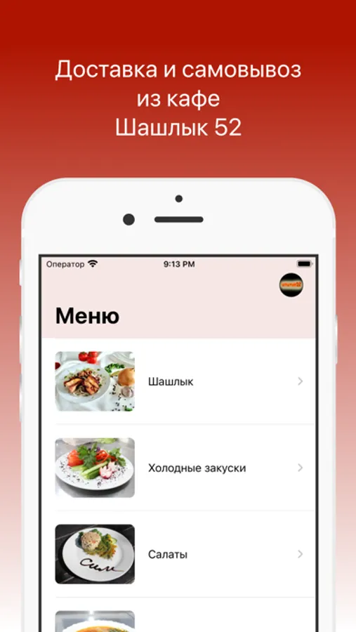 Как сделать заказ в приложении “Кафе Шашлык 52”: выберите понравившиеся позиции из меню, добавьте их в корзину и перейдите на экран оформления заказа (по нажатию на иконку корзины).