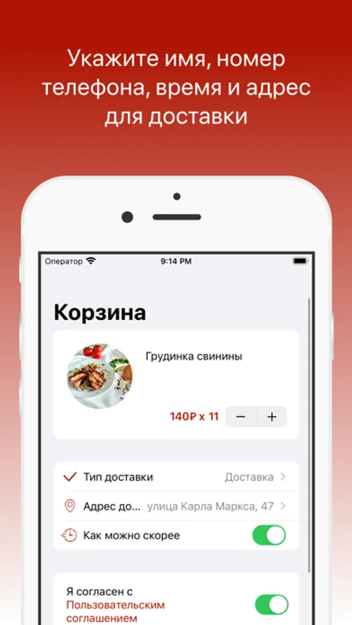 Укажите время, когда хотите прийти за своим заказом или выберите доставку с указанием времени и адреса доставки.