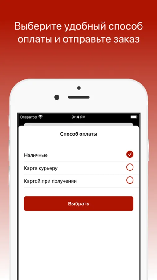 Выберите способ оплаты: Наличными или картой. Примите правила оплаты и нажмите кнопку “Заказать”.