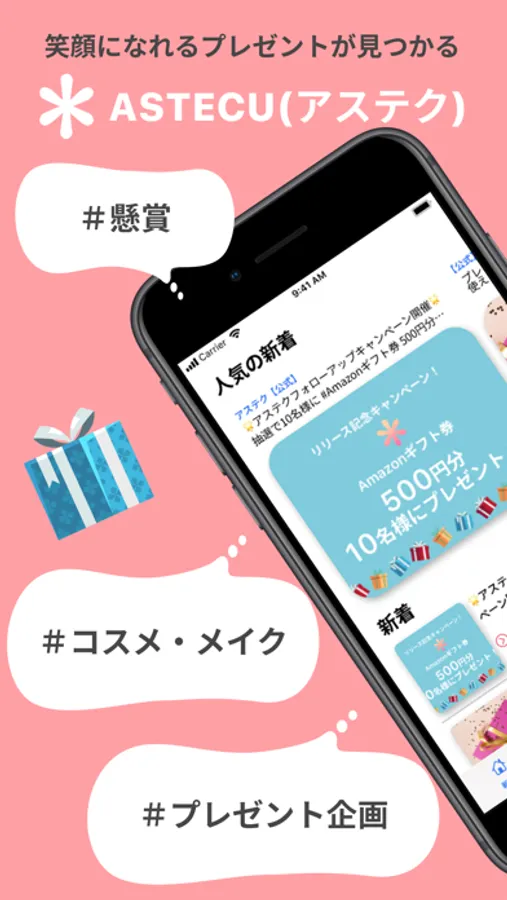 ASTECU(アステク)は、毎日SNSで行われている多くの懸賞やキャンペーン情報を独自AIを使って情報を集め、ユーザーが気軽に応募できる懸賞情報アプリになります。