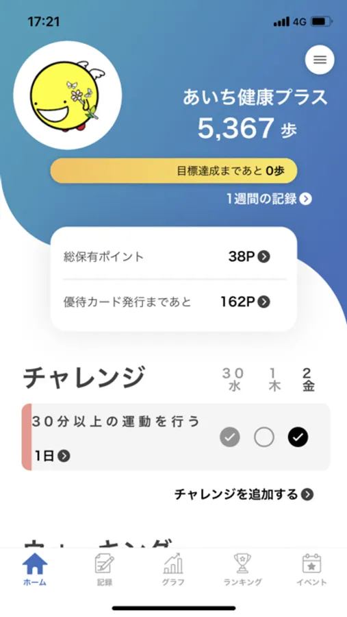 所定のポイントが貯まると、愛知県内の協力店で特典が受けられる優待カード「まいか」が取得・表示できます。