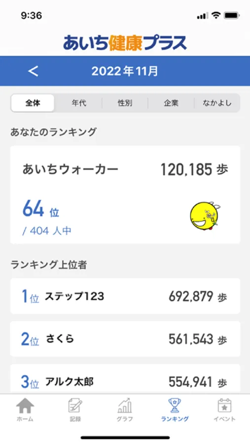 歩数の計測・記録/チャレンジの取組記録/体重(BMI)/血圧/生活記録/健(検)診/歩数・体重・血圧・消費カロリーの推移をグラフ表示/ランキング(全体・年代・性別・企業)/グループランキング(企業)イベント参加登録/バーチャルウォーキング/お知らせ配信/アンケート/引継ぎ機能/お問い合わせ