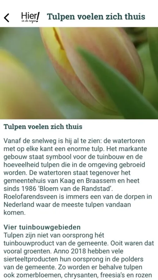 Met de Hier in de regio app blijf je op de hoogte van alles wat er speelt in Kaag en Braassem. Lees de laatste nieuws- en sportberichten, bekijk de lokale evenementen en lees de leuke achtergrondverhalen en weetjes over Kaag en Braassem. De Hier in de regio app biedt een up-to-date agenda met de leukste evenementen en uitjes. Dagje weg? Bekijk dan het complete overzicht van alle toeristische en recreatieve mogelijkheden die Kaag en Braassem te bieden heeft. Winkelen? De app biedt een overzicht van de lokale winkels en leuke adressen waar lekkere streekproducten te koop zijn. Lekker uit eten? Laat je dan verrassen door de vele eetgelegenheden die er zijn. Ook te vinden in deze app zijn aantrekkelijke wandel-, fiets- en vaarroutes door onze mooie regio. Kortom, de Hier! in de regio app is een must voor zowel de inwoner als de bezoeker van Kaag en Braassem.