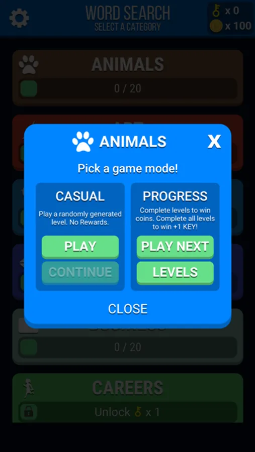 Play Casual or Progress game modes! In the casual game mode, you can generate a new random game board to play at your own leisure. In Progress mode there are a number of levels you must beat to gain coins and keys! Coins can be used to give you hints on difficult levels and keys can be used to unlock new categories!