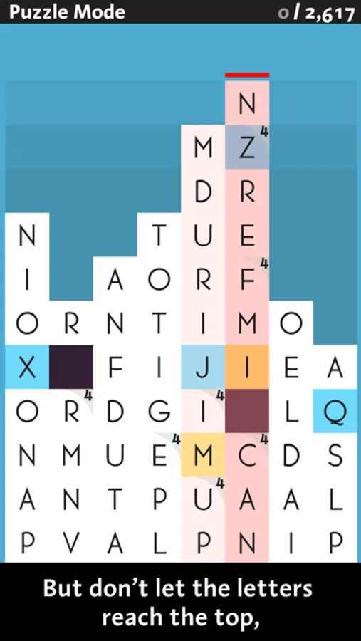 Pick your words wisely! As you play, more tiles rise from the bottom of the screen! It'll take all of your lexicological wits, and tactical know-how to keep your columns down. If any letters make it to the top row, it's game over.