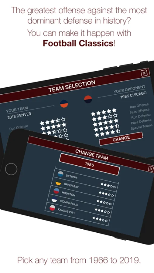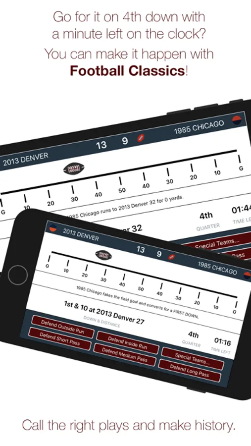 Follow the footsteps of the greatest coaches in history, call the right plays and lead your team to victory. Going for it on 4th down to ice the game? Trying an onside kick to start the 2nd half? A long touchdown bomb on 3rd and inches? You can do it all with Football Classics.