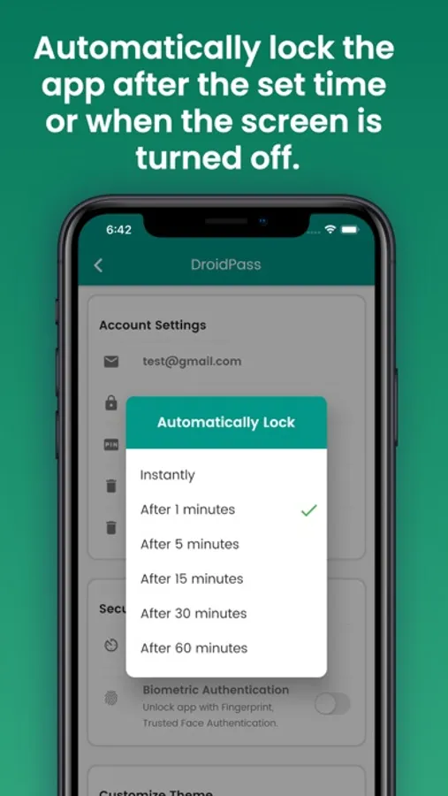 ∙ Automatically lock the app after a set time or when the screen is turned off.