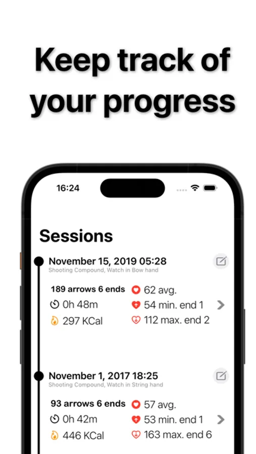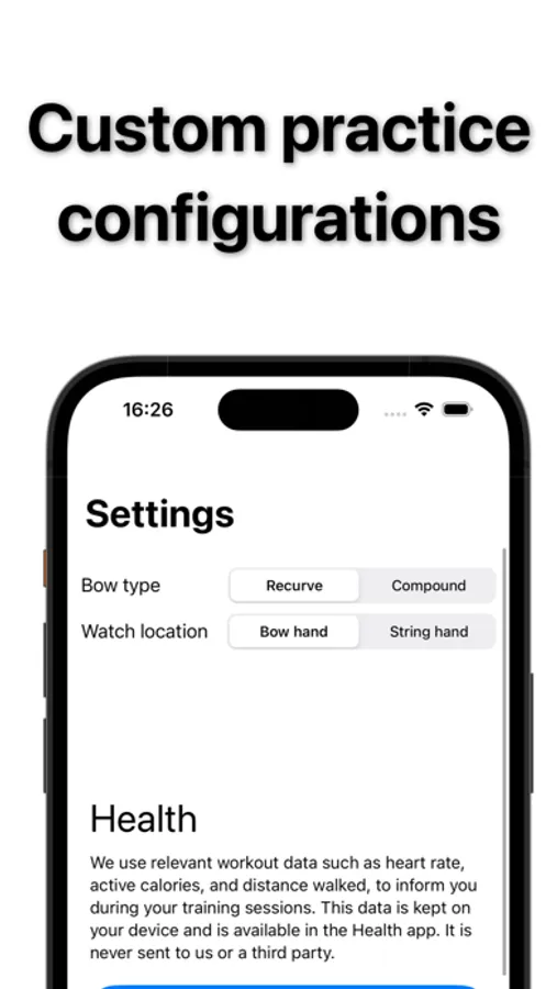 Easily start Archery Workouts on your apple watch that are saved to the Activity app so you can add to your rings and share it with friends.