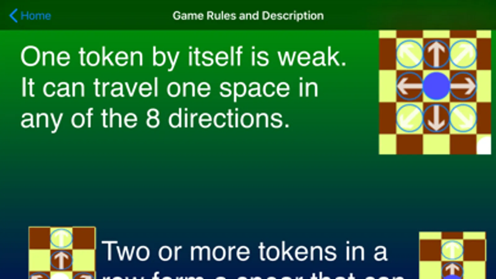One token by itself is weak. It can travel one space in any of the 8 directions. Two or more tokens in a row form a spear that can travel its own length.