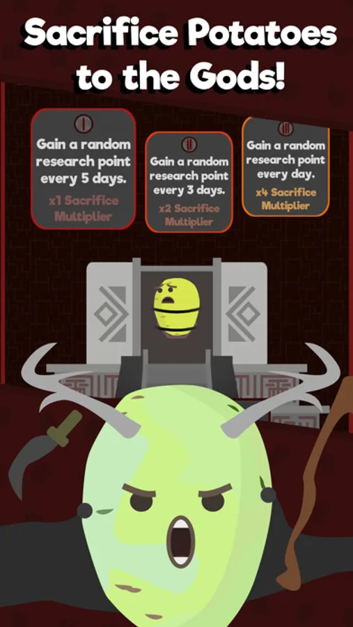 The potatoes follow a very strict faith and will pray to deities that require potato sacrifices daily. Choose your potato god to get your favorite bonuses, and above all else, make sure you have enough sacrifice!