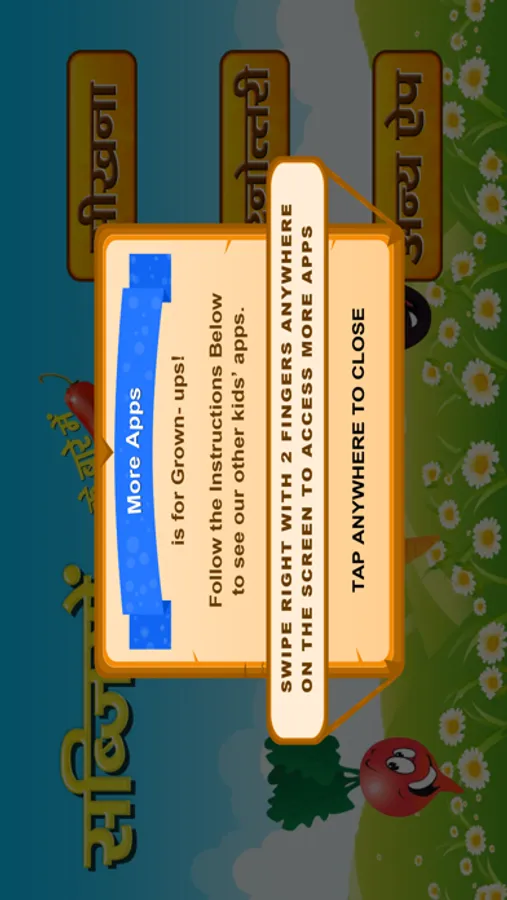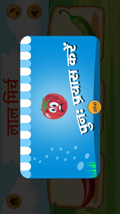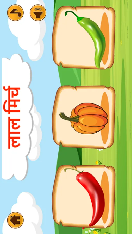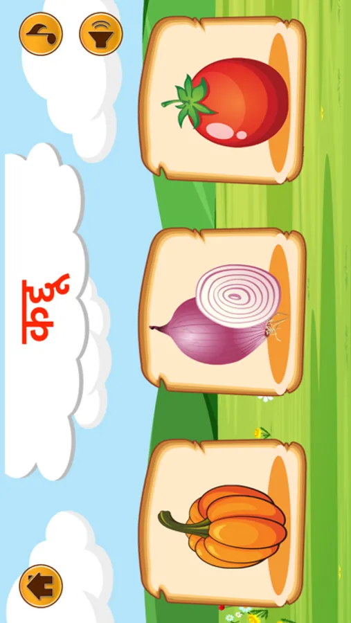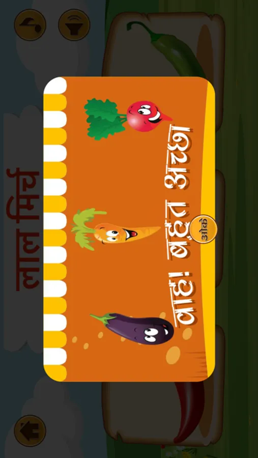 सीखना: यह विभिन्न सब्जियों के बारे में जानने और उन्हें पहचानने का प्राथमिक खंड है। स्क्रीन पर विभिन्न सब्जियों के चित्र एक आवाज के साथ दिखाई देते हैं जो सब्जी के नाम का सही उच्चारण करते हैं।