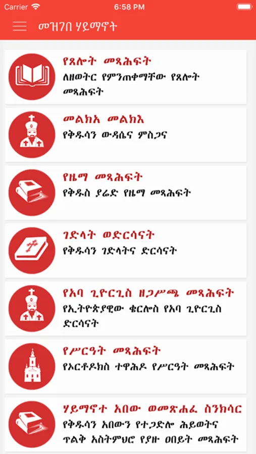 Mezgebe Haymanot is a mobile application with huge Ethiopian Orthodox Tewahedo Church Books Collection. The Application contains more than 200 Orthodox books with multiple categories. The application contains multiple prayer books, rites, psalmodies, hymns, melodies, services, sacraments of the Ethiopian Orthodox Church. Hymn books of saint Yared, Liturgical books, Books of Aba Giyorgis Zegasicha, Prayers of Saints and Angels, Bible Commentaries, Canonical Books,