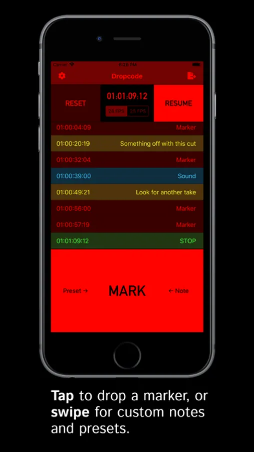 When you're watching down a cut, you should be paying attention to what's on the screen—not your notepad or phone. With Dropcode, you don't even have to look down. Just tap the bottom of the screen to drop a marker at the current timecode.
