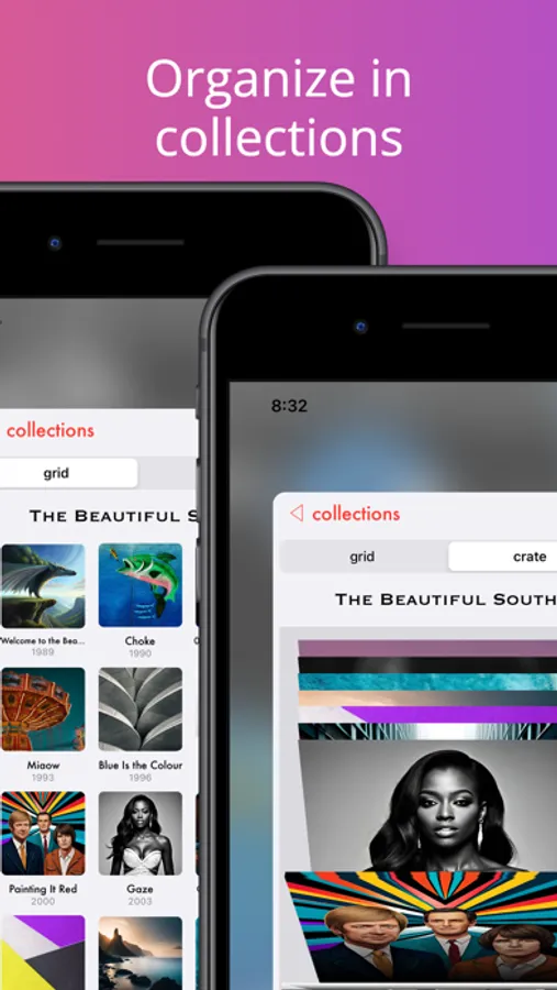 * Browse collections in grid mode or switch to "crate" mode for a more authentic record-flipping experience.