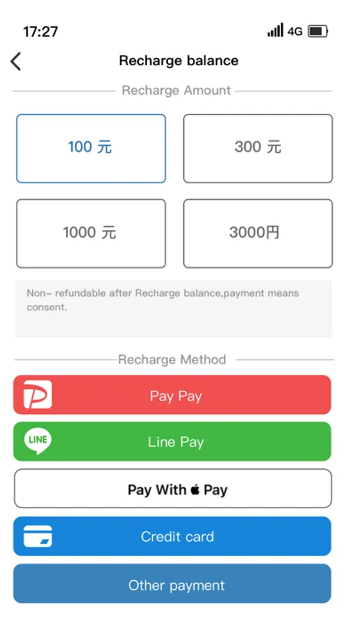 •You can choose PayPay, credit card, etc. to recharge