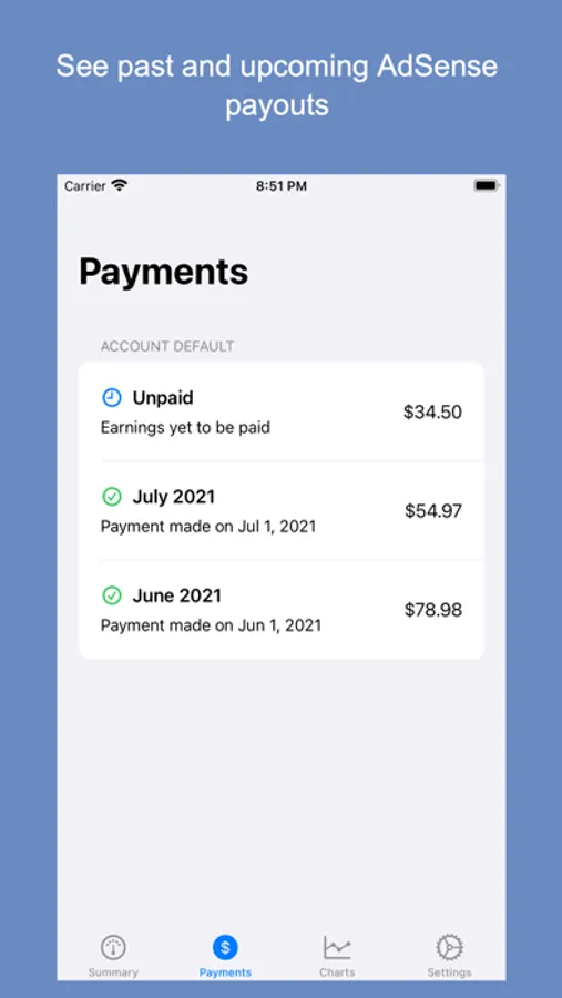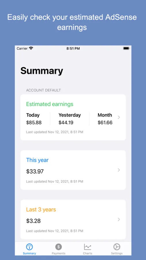 Keep on top of your Google AdSense and AdMob earnings and payouts using Adsensory.