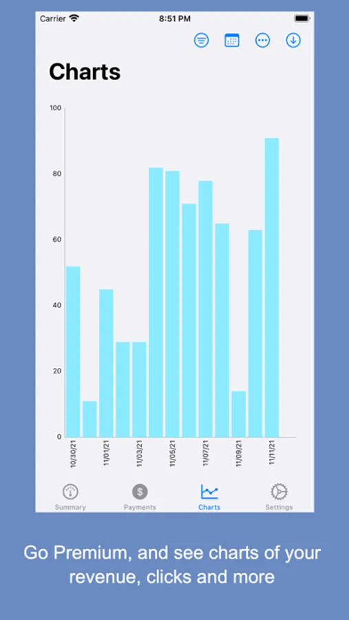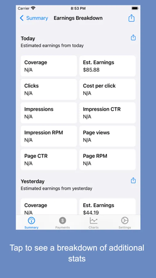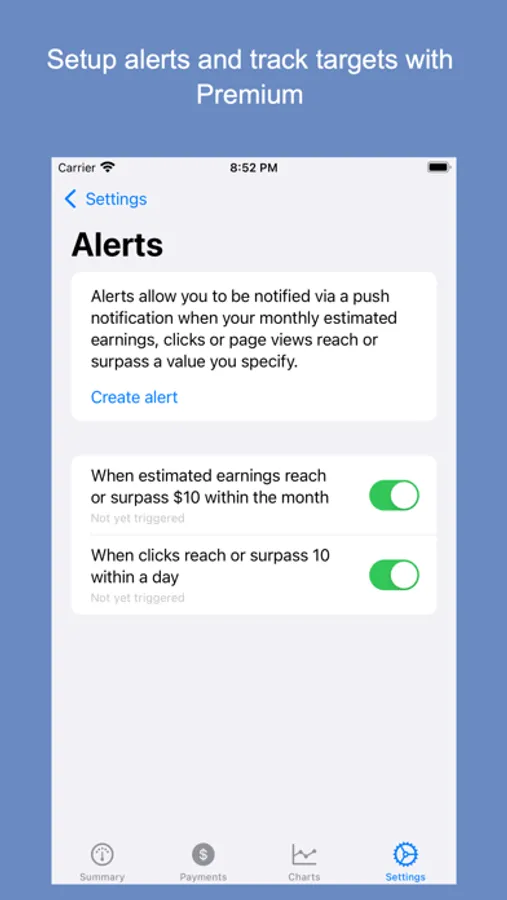 Purchase Premium and gain access to more features, including the ability to create and export charts within the app, widgets, get alerts when you reach earnings goals based on estimated earnings, click and page views, export data and more!