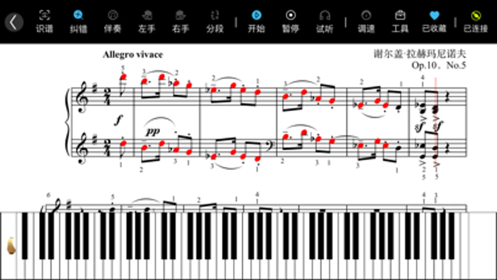 人工智能考核每次弹奏的准确度,节奏时值判断精确到毫秒,准确判断每次弹奏的错音、节奏不准音、多弹音,分不同颜色在曲谱上实时标注,清晰明了!每次曲谱弹奏结束会给出综合评分!