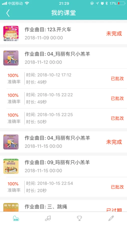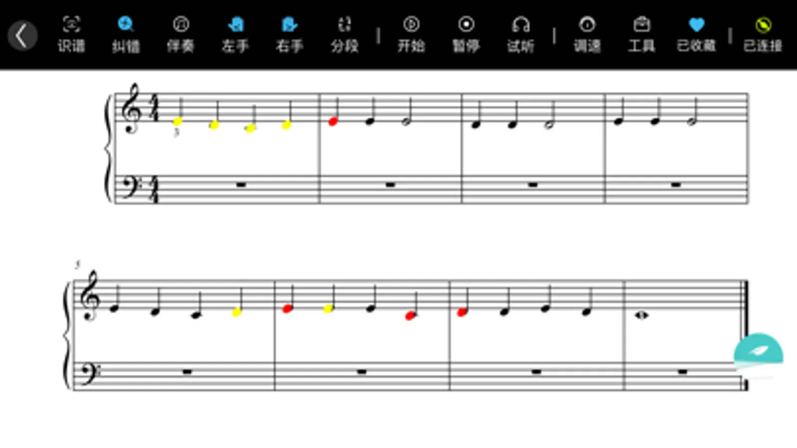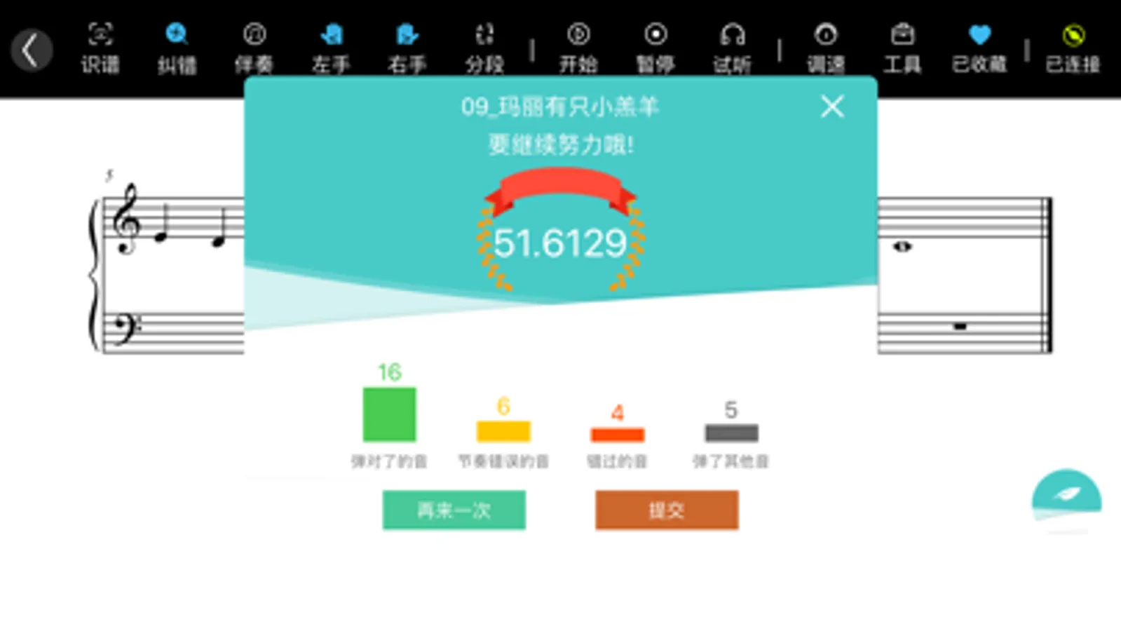 3、“纠错”模式:标示出每个音符弹奏的准确度、节奏的准确性,最终给予评分;