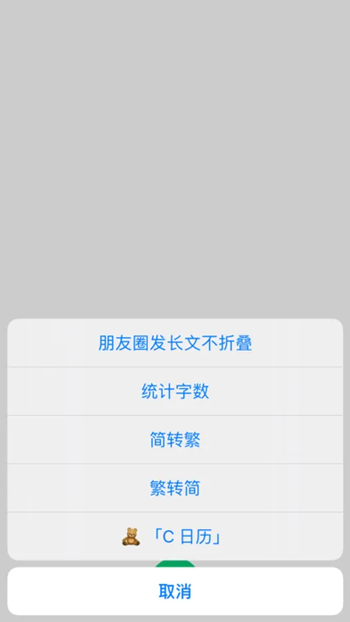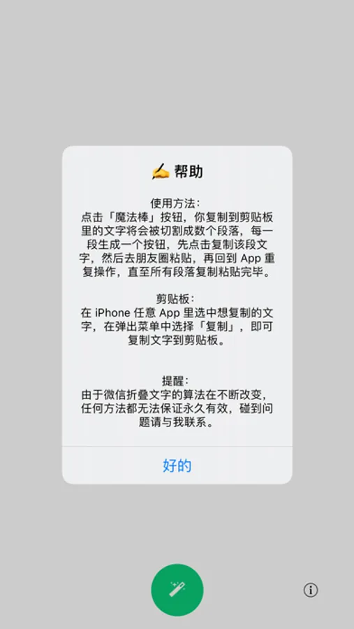 点击「朋友圈发长文不折叠」按钮,你复制到剪贴板里的文字将会被切割成数个段落,每一段生成一个按钮,先点击复制该段文字,然后去朋友圈粘贴,再回到 App 重复操作,直至所有段落复制粘贴完毕。如此操作,大部分情况下长文不会折叠。由于微信折叠文字的算法在不断改变,任何方法都无法保证永久有效,碰到问题请与我联系。