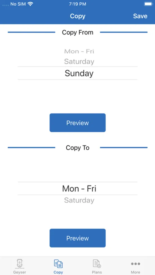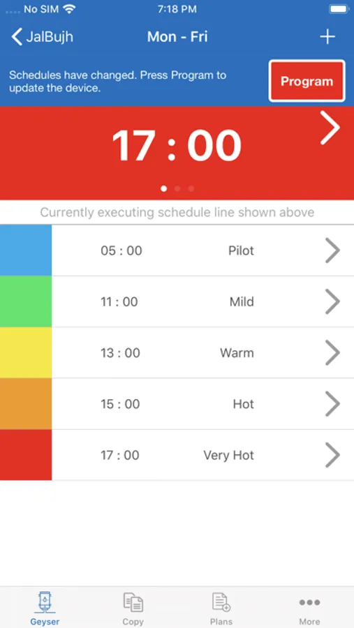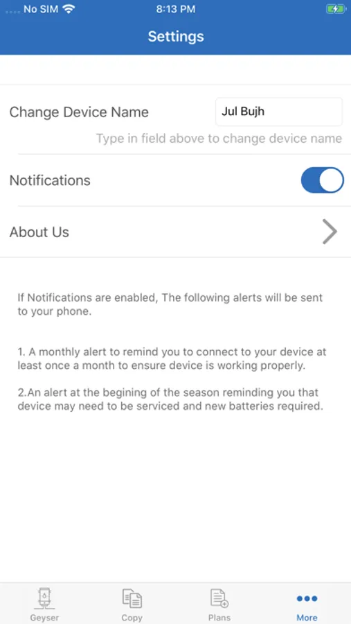 This App can be used to control Jal Bujh Geyser Timer Device. The App is used to give a heating schedule to the water geyser. Jal Bujh Geyser Timer Device snaps on to an existing thermostat on a water heater and adjusts its setting based on the schedule programmed in it through the App. The App also generates useful periodic notifications to remind the user to check battery status and perform seasonal maintenance.