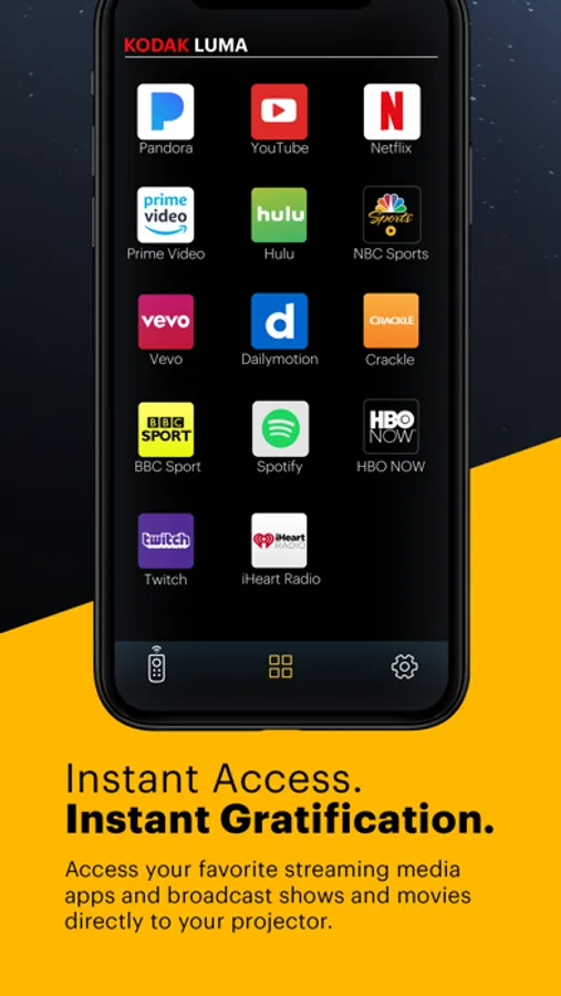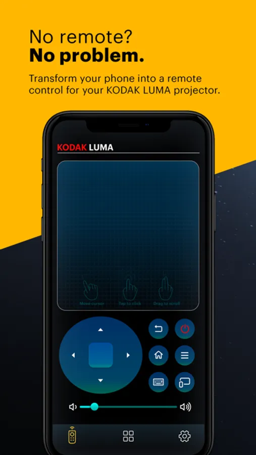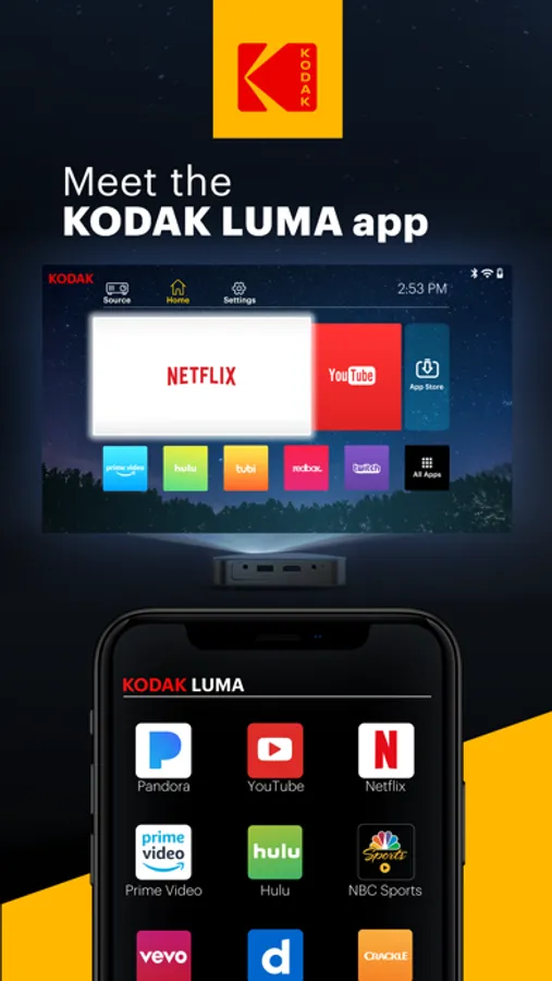The KODAK LUMA app is designed to work seamlessly as a companion to your KODAK LUMA 350 portable smart projector. Easily turn your phone into a remote, so you can navigate between menus, open apps, adjust settings, and connect wirelessly to share and project your phone screen. We’ve even made it extra convenient for you by adding the ability to reverse-mirror your KODAK LUMA screen onto your phone! Download the KODAK LUMA companion app today and experience the next level in projection perfection.