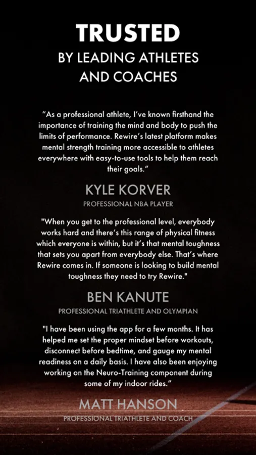 Our Mindset Recovery system uses scientifically proven protocols to optimize your mind and body to prepare, perform and recover. The different protocols used in Rewire are also used individually by elite athletes, Navy SEALS, and high-performing individuals around the world. For the first time, Rewire has combined all of these protocols into a single comprehensive system.