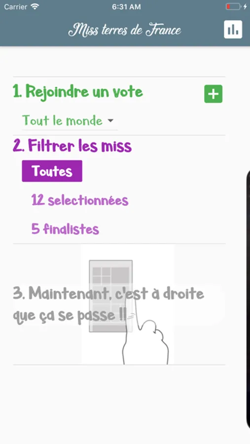 - Retrouvez les statistiques (miss préférées du groupe, la presonne du groupe ayant trouvé le plus de miss sélectionnées...) dans le menu dédié