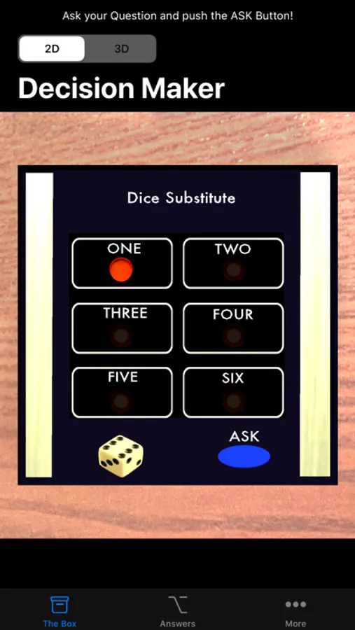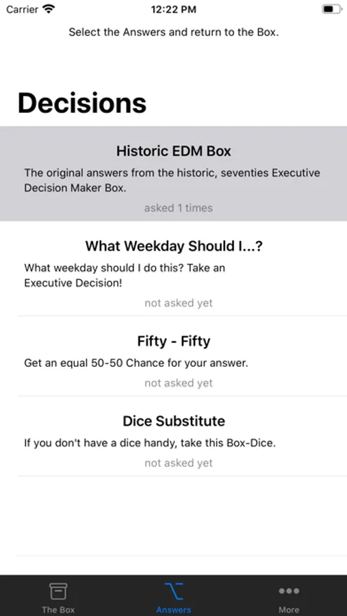 - Choose between several predefined answer sets, including "The classic answer set", "What Weekday should I...?, "Fifty-Fifty" and a "Dice Substitute" if you have forgotten your dice for a quick game.