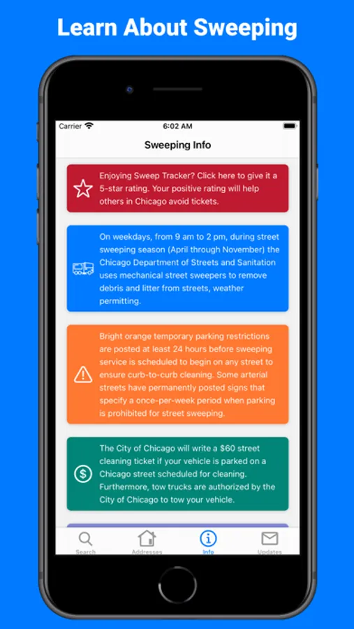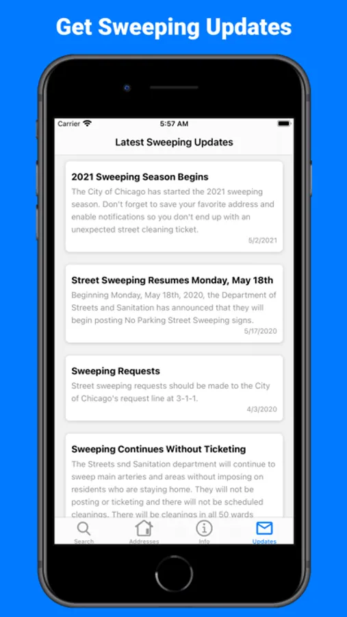 Track the Chicago street cleaning schedule and set up push notifications to avoid street cleaning tickets. View your neighborhood sweep schedule using maps, lists, and calendars. Enable push notifications to be alerted up to 7 days before each sweep. The calendar page allows you to add a reminder or event in your calendar if you only want to be alerted for specific sweeps.