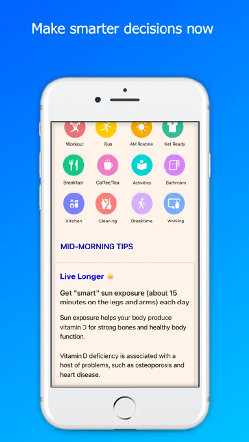 Rize summarizes the world's information into actionable, concise tips. The tips are only displayed when they are relevant to you (based on time, location, and your input). So, every time you open the app, you get the right information and the right time to live a smarter, happier, and healthier life.