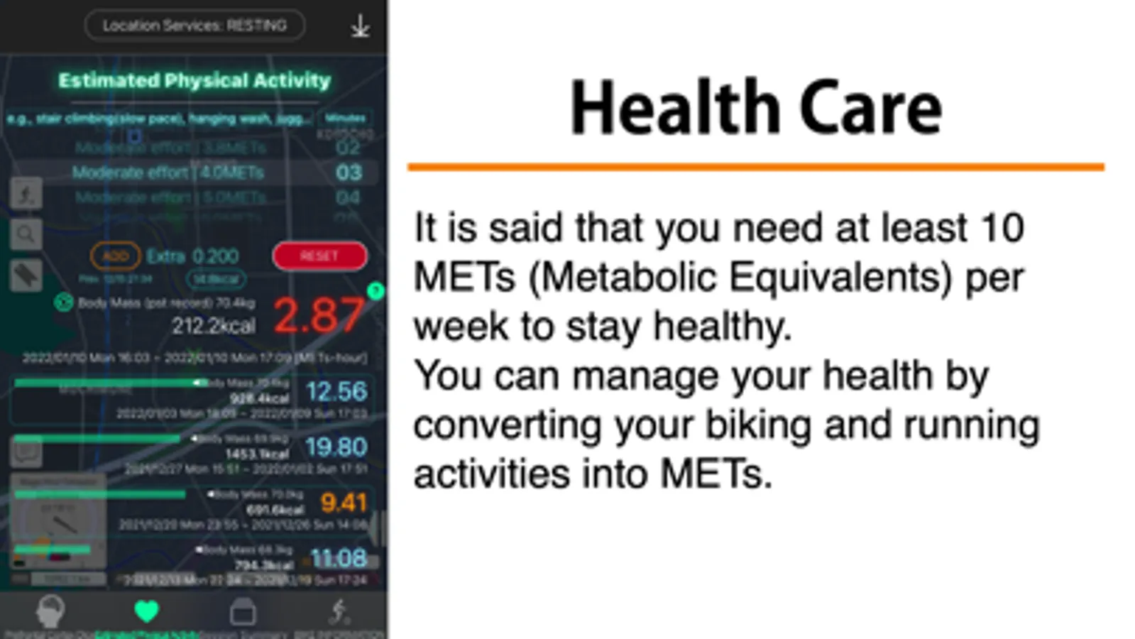 This App estimates the magnitude of your physical activity and shows it as METs•Hour (a product of Metabolic Equivalents of tasks and activity duration in hour). The estimated physical activity magnitude can be converted into calories burned. In doing so, this app needs your body mass data and has to communicate with Health App to obtain the data.