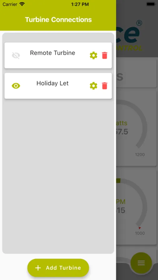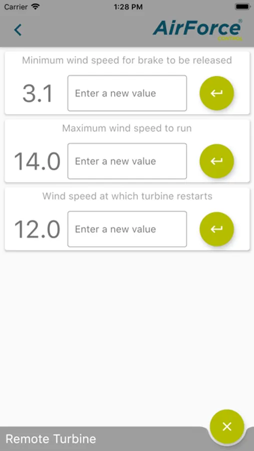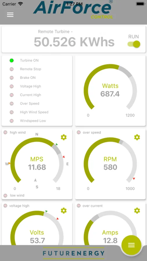 Monitor and control your FuturEnergy AirForce 1 (1-Kw) wind turbine with this app. The app provides a live continuous data stream that provides remote monitoring and the ability to change turbine settings including starting and stopping the turbine. Multiple turbine installations can be saved as connections for convenient switching between each.