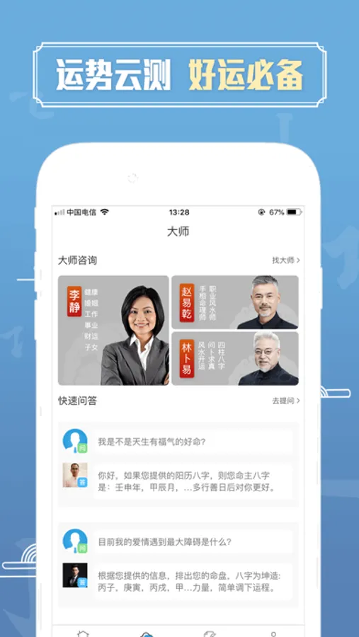 集各路民间大师,包括:命理分析、手相手诊、易经八卦风水、星座占卜、运势解析、开光加持等各方面大师。为您提供专业服务。