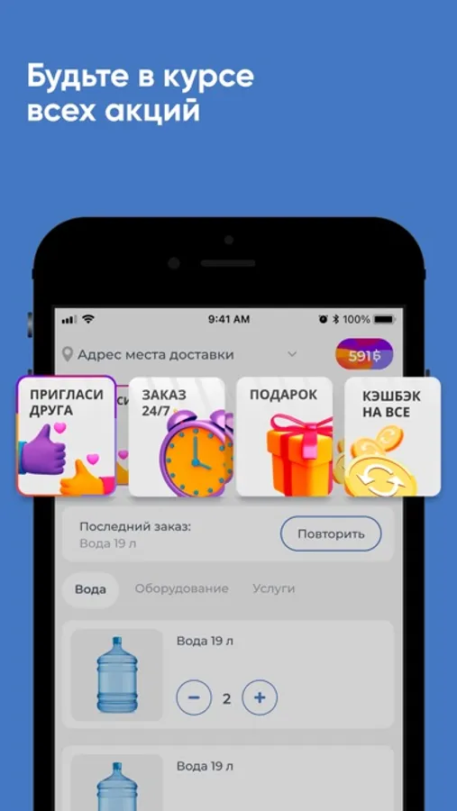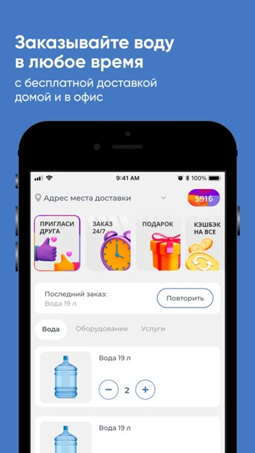 Скачайте бесплатное приложение на телефон и заказывайте чистую воду в удобное время!