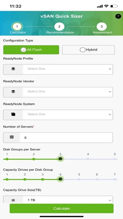 1.Size with Minimal Inputs: As this app is meant for quick sizing, we ask users for minimal inputs required to estimate vSAN sizing. Along with providing number of servers, you can choose to provide inputs for Configuration type, ReadyNode (Server) Vendor/System, Disk Groups/ Drive configuration, FTT and Dedup values. We have provided default values based on average vSAN deployment configurations. The more information you provide, the more precise will be the recommendation. You can alter these values based on your desired usable capacity.