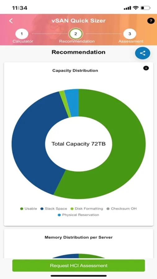 2.Instantly Receive a Sizing Recommendation: After providing the inputs, the recommendation page gives you insights into your sizing, including capacity distribution, memory distribution, number and type of licenses you will need and a summary of your inputs. You can also share the pdf sizing report with others directly from the app.